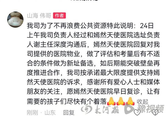 24日上午,该场地企业负责人在社交平台评论区回复称:嫣然天使医院经过评估考量后认为该处有不适合的条件做新址备选,如后期能突破壁垒再度推进合作,将按承诺最大限度提供支持嫣然天使医院的诉求。
